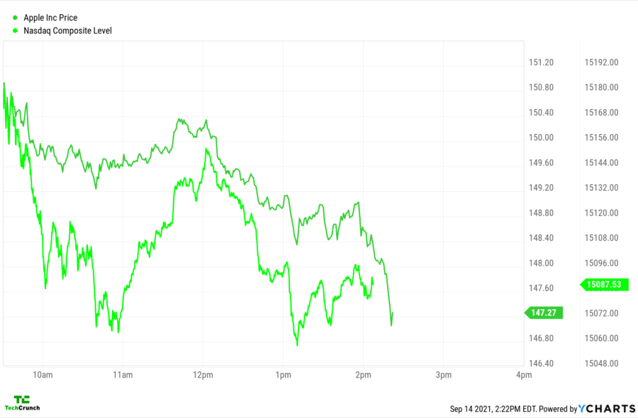 This is a one-day chart, mind, so we’re looking at intraday changes. We’re zoomed in. And Apple kinda took a bit of a dive during its event that kicked off at 1 p.m. in the above chart.