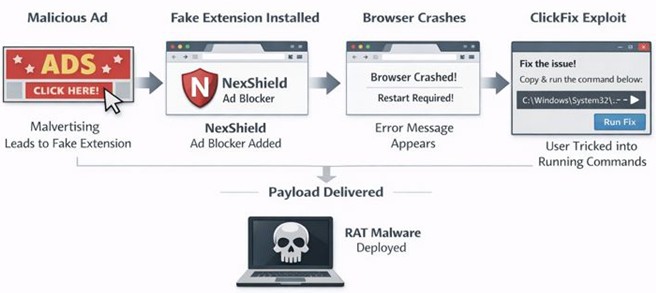 1. Initial access: Users searching for ad blockers are redirected via malicious ads to install the NexShield extension, which impersonates uBlock Origin and falsely cites its developer.