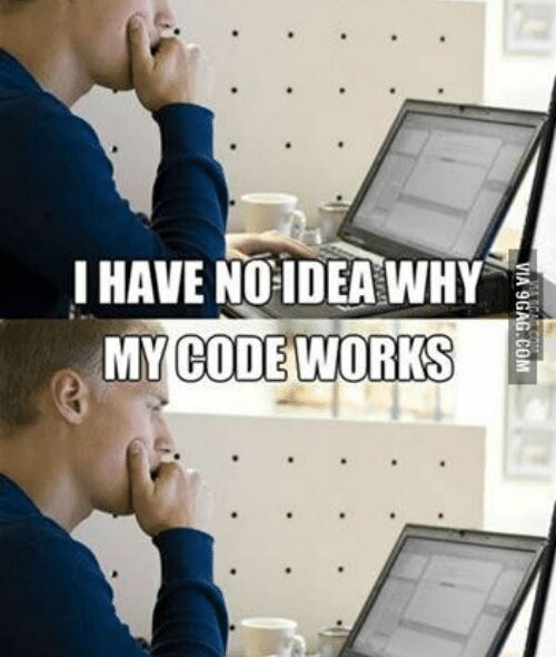 A meme of a man staring at a computer, puzzled, repeated twice. First, he thinks: 'My code doesn't work, I have no idea why.'. Second, he thinks: 'My code works, I have no idea why.